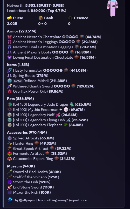 6B NW 274 lvl SB account 46.11 AVG 2B PURCE MAXED TERM Networth: 5,953,839,837 (5.95B) Account Full access 30 slots minions cata 33