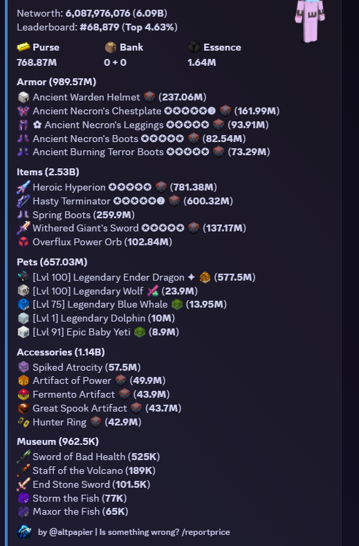 6B NW 274 lvl SB account 46.11 AVG 2B PURCE MAXED TERMNetworth: 6,087,976,076 (6.09B) Account Full access 30 slots minions cata 33 Coop Profile