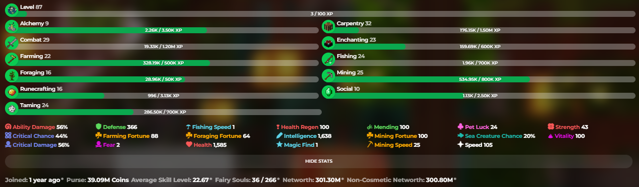 ✅❗️Solo-Coop | MVP+ | 87 SB lvl | 22.67 AVG | Cata 26 | 301.37M NW | Full accept | Hypixel SkyBlock❗