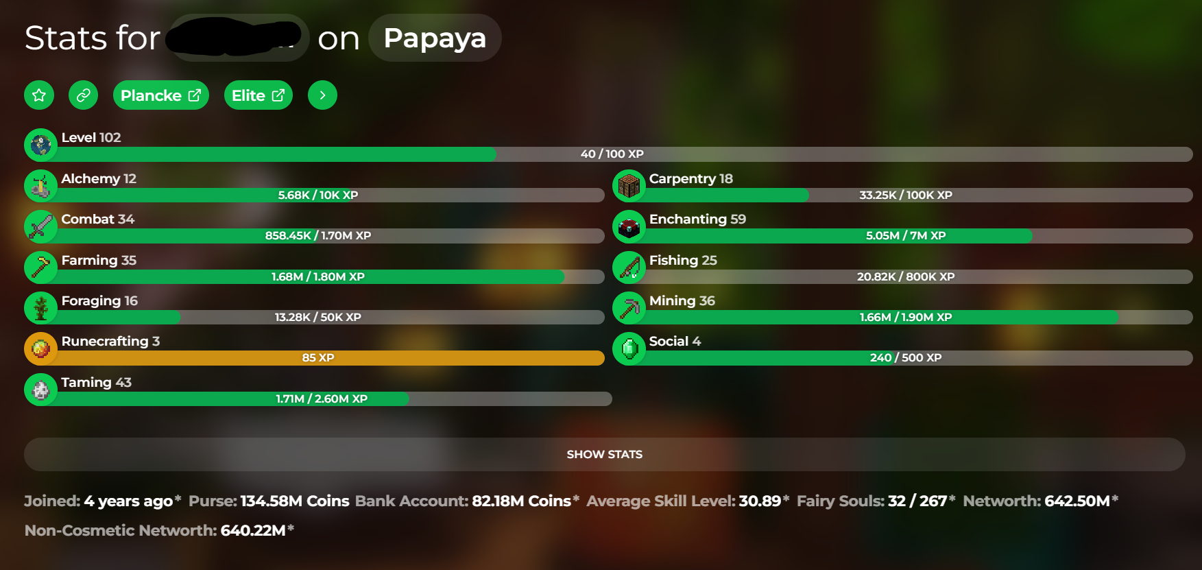 Minecraft account / Skill average 31( Combat 34 /Mining 36 ) / NW 640M / Hypixel lvl 102 / Cata 28