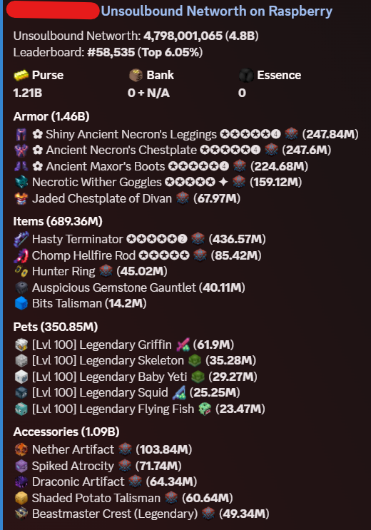 • 1.1B Worth Accessories (Nether Artifact, Spiked Atrocity, Draconic Artifact, Great Spook Artifact, Beastmaster Crest, Many More)