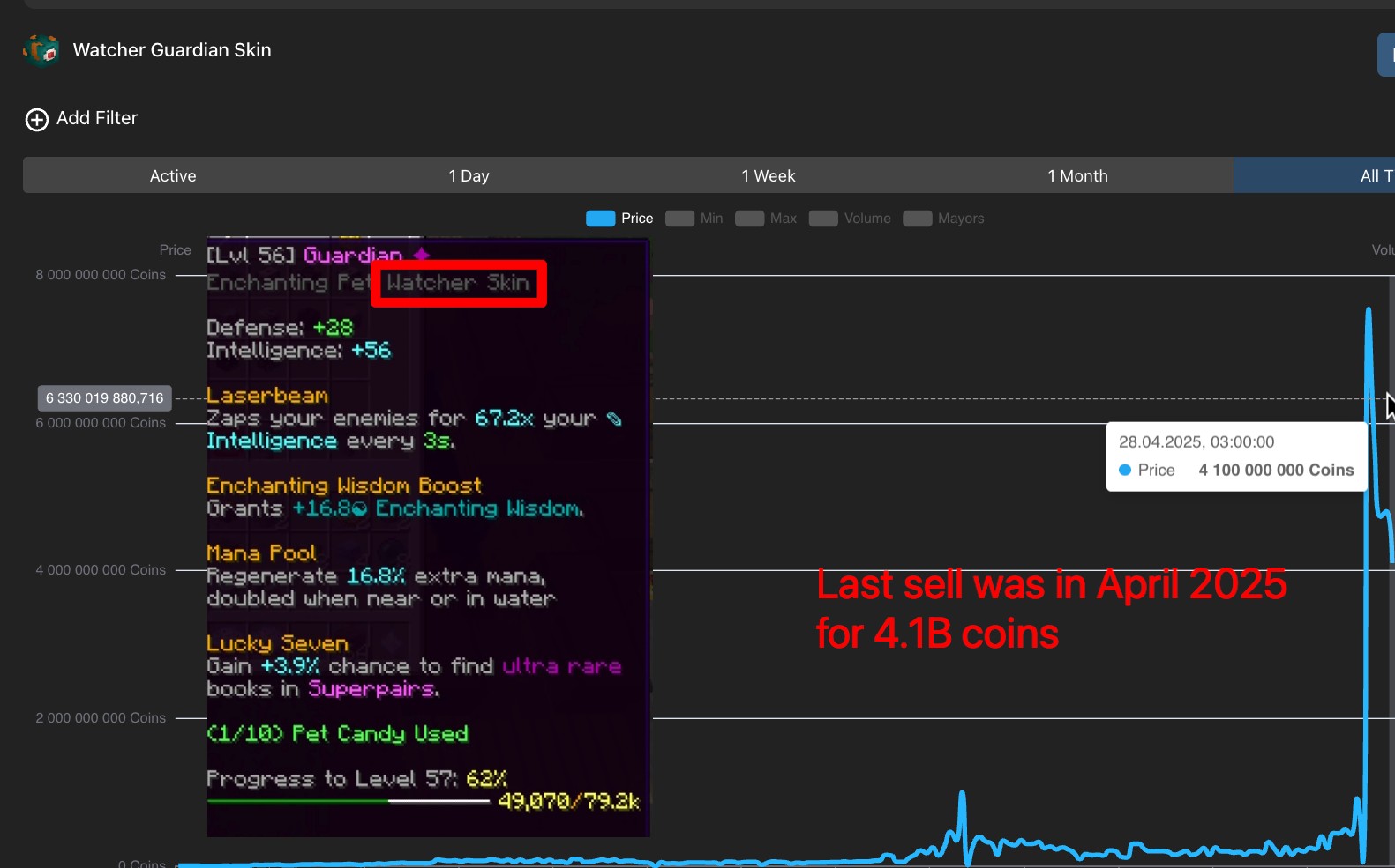 - Networth: ~5.1B (4.9-5.0B unsoulbound) !!! GUARDIAN PET WITH A VERY RARE SKIN WHICH NOT COUNTING IN WEBSITES !!! LAST SALE OF THE SKIN WAS 04/28/2025 FOR 4.1B COINS, IN MARCH 2025 THE SKIN PRICE WAS MORE THAN 7.5B COINS !!! PROOF: https://sky.coflnet.com/item/PET_SKIN_GUARDIAN?range=full