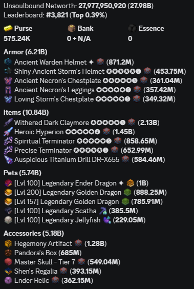 Profile comes with amazing cake bag, cool pet skins, cool armor and swords, more stuff in chests, there are +300m to collect from minions for xp and money, diamond sadan head,