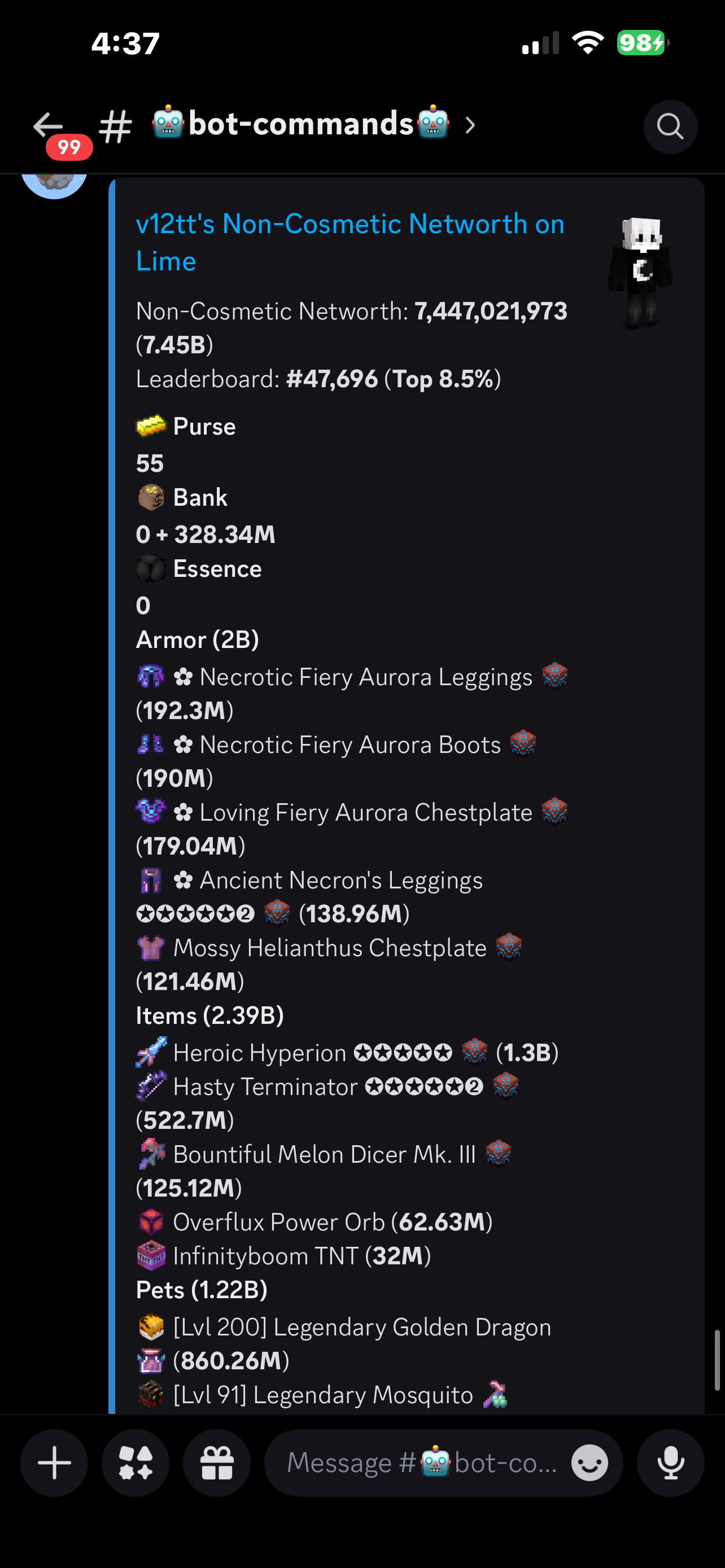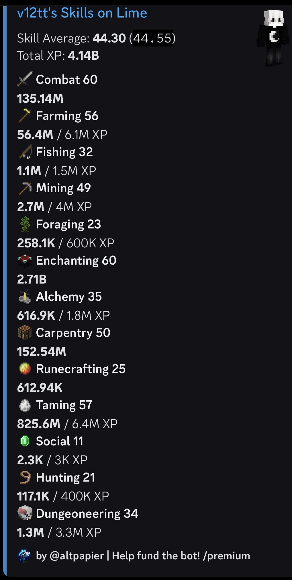 Selling skyblock account (not ratted or stolen) 7.45b networth with a 44.55 skill average.