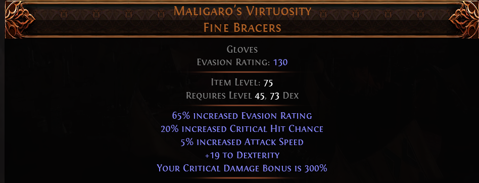 RISE OF THE ABYSS Maligaro's Virtuosity UNIQUE GLOVES LVL 45 REQ 300% CRITICAL DMG BONUS CRIT CHANCE