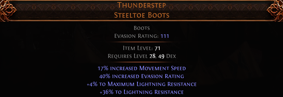 RISE OF THE ABYSSAL Thunderstep UNIQUE BOOTS LVL 28 REQ MOVEMENT SPEED LIGHTNING RESIST EVASION BOOT