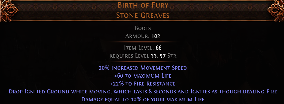 RISE OF THE ABYSSAL Birth of Fury UNIQUE BOOTS LVL 33 REQ IGNITES GROUND N 20% MOVEMENT SPEED