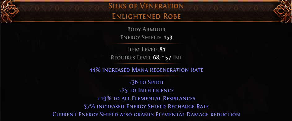 RISE OF THE ABYSS Silks of Veneration UNIQUE CHEST LVL 68 ENERGY SHIELD GRANTS ELE PROTECT SPIRIT