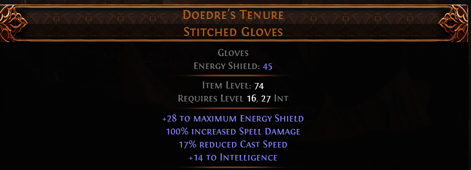 RISE OF THE ABYSSA Doedre's Tenure UNIQUE GLOVES LVL 16 REQ 100% SPELL DAMAGE SORCERESS WITCH GLOVES