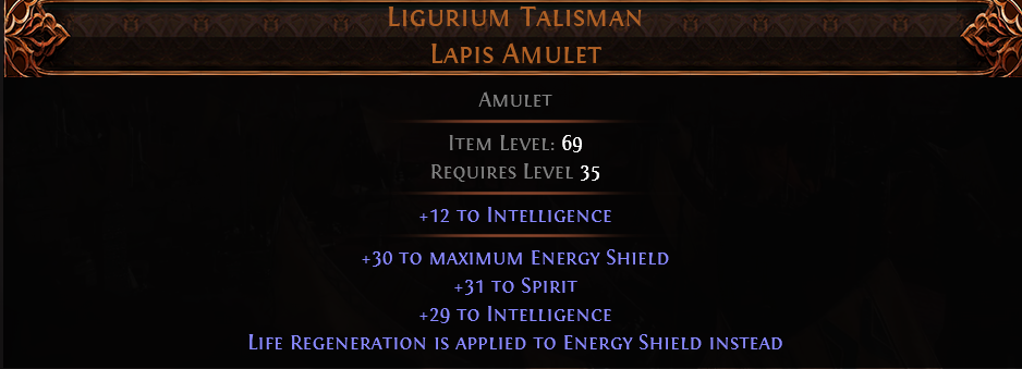 RISE OF THE ABYSS Ligurium Talisman UNIQUE AMULET LVL 35 REQ +30 SPIRIT +40 INTELLIGENCE ENERGY SH