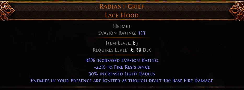 RISE OF THE ABYSSAL RADIANT GRIEF LACE HOOD UNIQUE HELMET HUNTRESS AMAZON HELM LVL 16 REQ IGNITES