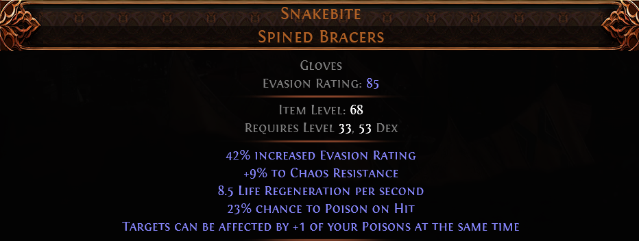RISE OF THE ABYSSAL Snakebite UNIQUE GLOVES LVL 33 REQ POISON DAMAGE GLOVES +1 POISON LOL
