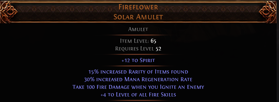 RISE OF THE ABYSSAL Fireflower Solar Amulet UNIQUE AMULET LVL 52 REQ +4 TO LEVEL ALL FIRE SKILLS