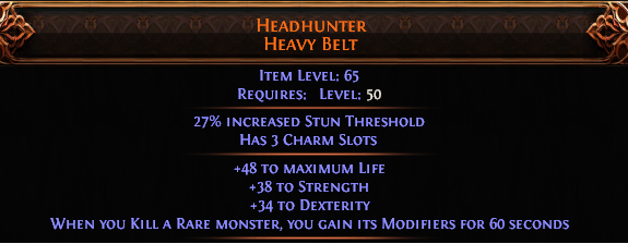 3 CHARM SLOT HEADHUNTER HEAVY BELT UNIQUE BELT HEAD HUNTER BIS DEADEYE HUNTER BELT 30+STR 30+DEX ROL