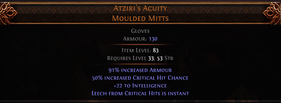 RISE OF THE ABYSSAL Atziri's Acuity UNIQUE GLOVES LVL 33 REQ 50% CRITICAL HIT CHANCE GLOVES