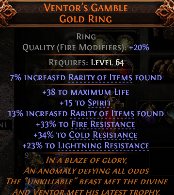 VENTOR'S GAMBLE GOLD RING 15 SPIRIT 20% RARITY FOUND +33 FIRE 34 COLD 23% LIGHTNING RESISTS 38 LIFE