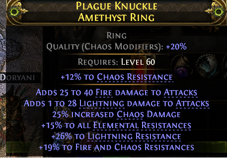 RING FIRE+LIGHTNING DMG CHAOS DAMAGE 15% ALL RESIST 31% CHAOS RESIST 26% LIGHT 19% FIRE RESISTS