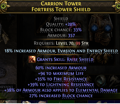 SHIELD 357 ARMOUR 94 LIFE 35% FIRE 39% LIGHT RESIST 33% BLOCK CHANCE 38% ARMOUR APPLIES TO ELE DMG