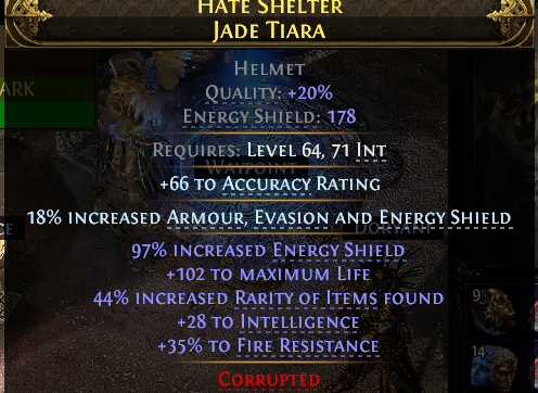 RARITY HELM 44% RARITY 178 ENERGY SHIELD 102 LIFE 28 INTELLIGENCE 35% FIRE RESIST