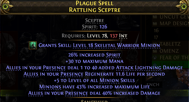RATTLING SCEPTRE +5 MINION SKILLS 40% INCREASED DMG 126 SPIRIT LIGHT DMG REGEN INFERNALIST WITCH