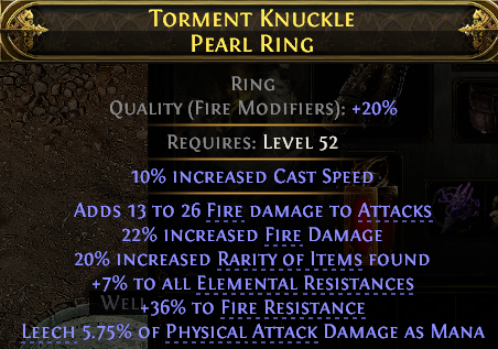 RING HIGH FIRE DMG 22% FIRE DMG 20% RARIT 7% ALL RES 36% FIRE RES MANA LEECH CAST SPEED