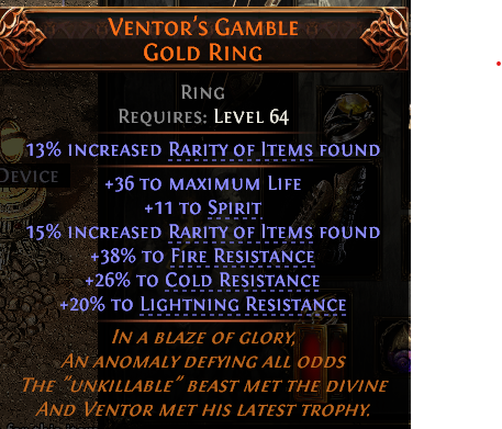 VENTOR'S GAMBLE 11 SPIRIT 36 LIFE 28% RARITY +38/26/20% RESISTS MINION WITCH LICH INFERNALIST RING