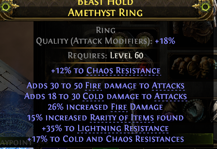 AMETHYST RING HUGE FIRE+COLD DMG 26% FIRE DMG 15% RARITY 35% LIGHT 17% COLD 29% CHAOS RESISTS