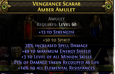 MINION WITCH LICH AMULET +3 MINION SKILLS 50 SPIRIT 14+ ALL RESIST 28% SPELL DMG 49 ES 13 STR