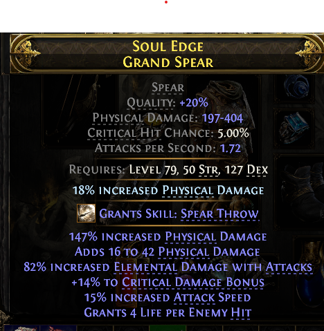 600+ DPS SPEAR 82% ELEMENTAL DMG 14% CRIT DMG BONUS 15% ATTACK SPEED HUNTRES AMAZON SPEAR WEAPON