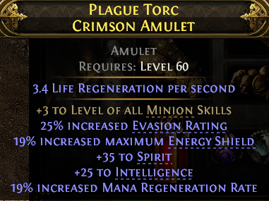 MINION WITCH AMULET +3 MINION SKILLS 35 SPIRIT 25 INT 19% E.S 19% MANA REGEN E.RATING INFERNALIST