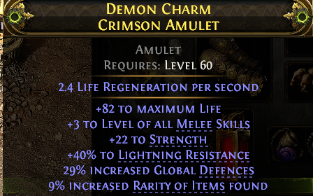BONESHATTER WARRIOR AMULET +3 MELEE SKILLS 82 LIFE 22 STR 40% LIGHT RES 29% GLOBAL DEFENCES 9 RARITY
