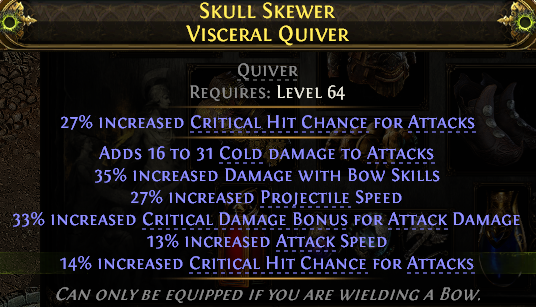 VISCERAL QUIVER COLD DMG 35% BOW SKILL DMG 27% PROJ SPEED 33% CRIT DMG BONUS 41% CRIT CHANCE 13% A.S