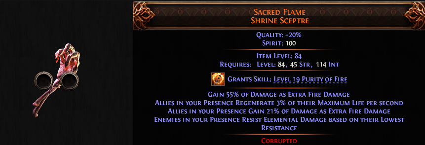 2 socketed Sacred Flame Shrine Sceptre 55%+ extra fire damage Lightning Spear Bleed Blood mage