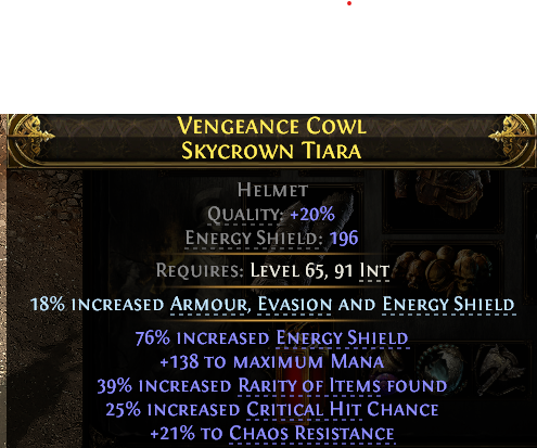 196 ES HELM 39% RARITY FOUND 138 MANA 25% CRIT CHANCE 21% CHAOS RESIST SORCERESS WITCH HELM