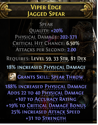 572 DPS SPEAR WITH 25% ATTACK SPEED 31 STR 16% CRIT DMG BONUS 106 ACCURACY HUNTRESS AMAZON RANGER