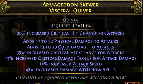 VISCERAL QUIVER HIGH COLD+PHYSICAL DMG 55% CRIT CHANCE 45% BOW SKILLS DMG 31% CRIT DMG BONUS 14% A.S