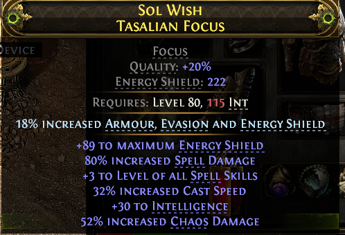 RISE OF THE ABYSSAL FOCUS +3 CHAOS SKILLS CAST SPEED 30 INT 80% SPELL DMG 52% CHAOS DMG 200 ENERGY S