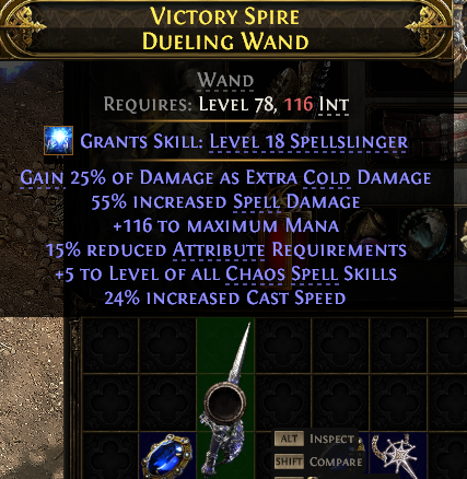 WAND WITH +5 CHAOS SKILLS 24% CAST SPEED 55% SPELL DMG 116 MANA EXTRA COLD DMG WITCH SORCERESS WAND