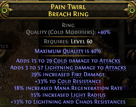 BREACH RING COLD+LIGHT DMG 33 COLD RES 29% FIRE DMG 13 LIGHT+CHAOS RESIST 18MANA REGEN