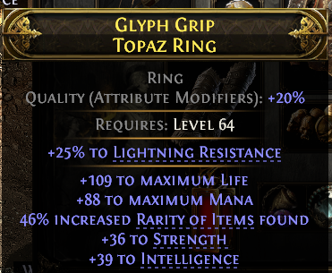 RING WITH 46% RARITY FOUND 109 LIFE 88 MANA 36 STRENGTH 39 INTELLIGENCE 25% LIGHNING RESISTANCE