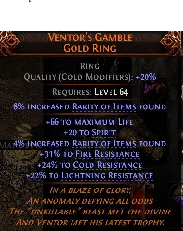 20 SPIRIT VENTOR'S GAMBLE RING 66 LIFE 12 RARITY +31/24/22 RESISTANCES INFERNALIST WITCH LICH MINION