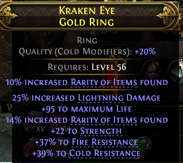 RING WITH 25% LIGHTNING DMG 95 LIFE 24% RARITY 22 STR 37% FIRE 39% COLD RESIST