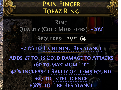 RARITY RING HIGH COLD DMG 42% RARITY FOUND 60 LIFE 27 INT 38% FIRE 21% LIGHT RESISTS DEADEYE MONK