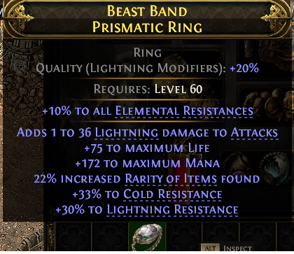 RING WITH LIGHT DMG 75 LIFE 172 MANA 22% RARITY 33% COLD 30% LIGHT RESIST 10% ALL RESIST