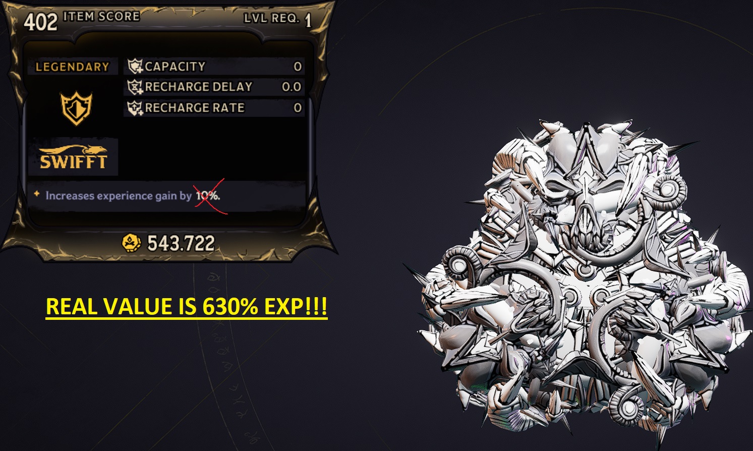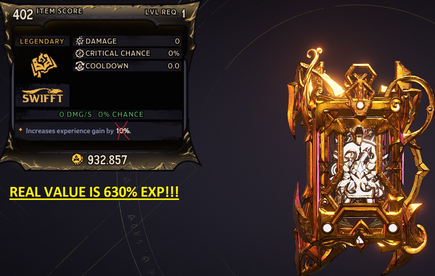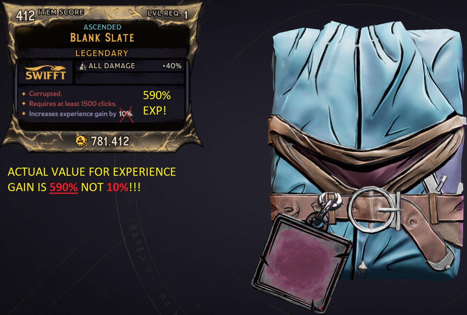 KEEP IN MIND THAT VISUAL EXP GAIN ON ITEM CARD IS 10% (IT CAN'T BE CHANGED) BUT ACTUAL EXP GAIN IS 630% ON SPELL/WARD AND 590% ON ARMOR - TOTAL 1850% EXP GAIN!!!