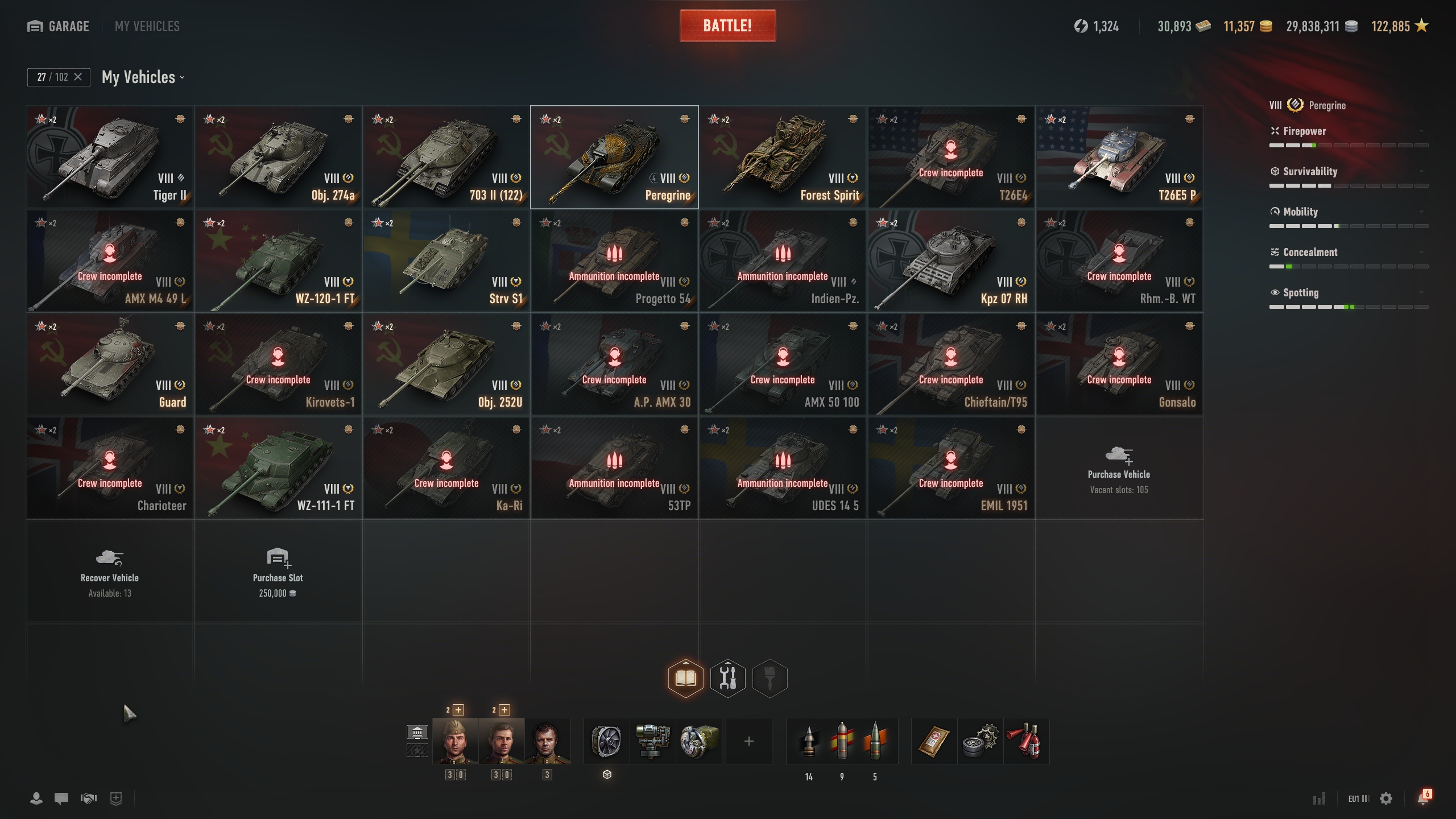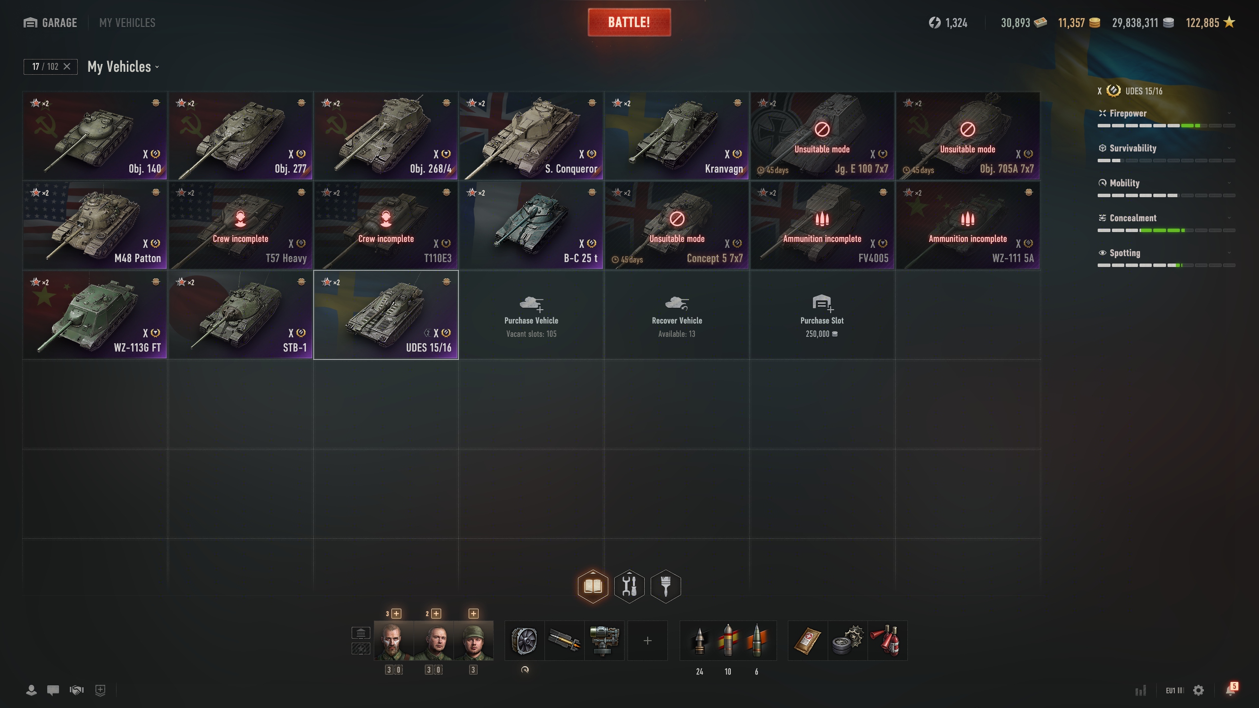 Object 277, Object 140, Object 268 v4, T57 Heavy, M48A5 Patton, WZ-111 5A, Bat.-Chat 25t, Super Conqueror, FV4005, STB-1, Kranvagn, UDES 15/16, T110E3, WZ-113G FT