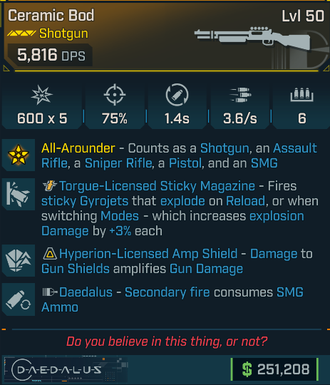 Ceramic Bod [smg ammo, Torgue sticky, Hyperion amp] (Daedalus shotgun)