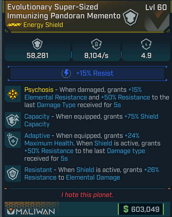 Pandoran Memento [Capacity, Adaptive, Resistant] (Maliwan shield)