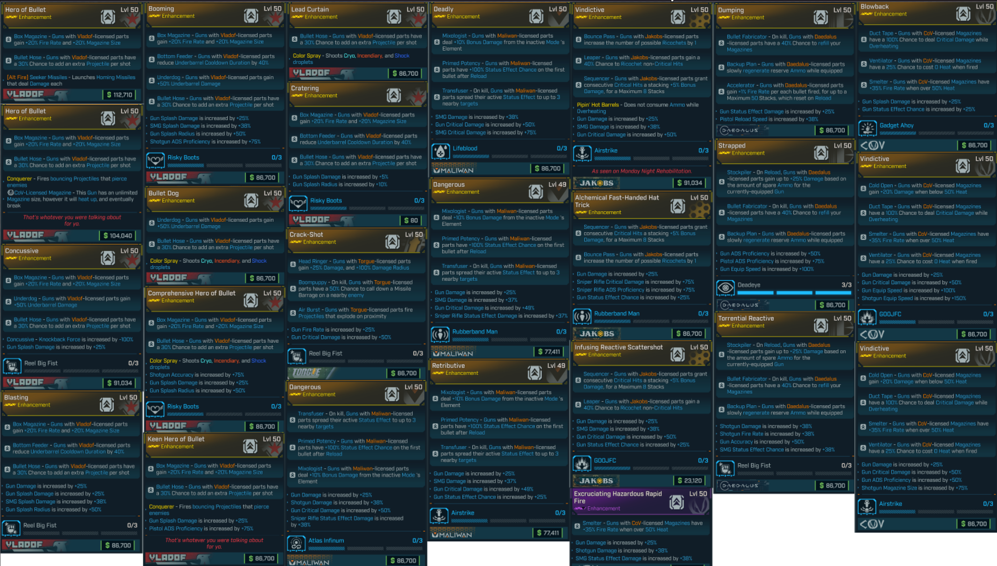 ◉ Hero of Bullet — Vladof guns go brrrr: huge fire rate + mag, extra projectiles, insane DPS. ◉ Comprehensive Hero of Bullet — Stacked “Hero” buffs in one: more fire rate/mag + bonus projectiles = nonstop mow-down. ◉ Zen Hero of Bullet — Same “Hero” damage with calmer recoil/handling for laser spraying. ◉ Booming — Massive splash radius + extra rockets; nukes groups. ◉ Blasting — More explosions per shot and faster explosive cooldowns; room clear. ◉ Concussive — Hard hits + knockback with extra projectile rolls; stun-locks packs. ◉ Fear of Bullet — Bouncy/ricochet shots that snowball damage across mobs. ◉ Bullet Dog — Ricochets + multi-element procs; reliable DoT and add clear. ◉ Lead Curtain — Practically infinite mag (heat-based) + ricochet spam; never stop firing. ◉ Deadly — Huge elemental status chance & ramping DoT; melts bars and bosses. ◉ Dangerous — More elemental stacks + damage scaling; chains kills fast. ◉ Retributive — Big post-reload opener + boosted gun/status damage; burst deletes. ◉ Vindictive — Massive damage while overheated, faster ADS/handling; Jakobs crit machine. ◉ Blowback — Reflect/return damage style uptime; punishes anything that hits you. ◉ Dumping — Reload = big damage amp + ammo return; perma-DPS cycle. ◉ Strapped — Reload converts spare ammo into bonus damage; burst nuke on swap/reload. ◉ Torrential Reactive — High RPM + reactive procs; extra bullets flying everywhere. ◉ Crack-Shot — First shot hits like a truck; perfect for opener/peek shots. ◉ Reactive Scattershot (variant) — Shotgun-focused splash + mag/reload buffs; close-range shredder. ◉ Excruciating Hazardous Rapid Fire — Pure fire-rate + DoT ramp; turns rifles into buzzsaws.