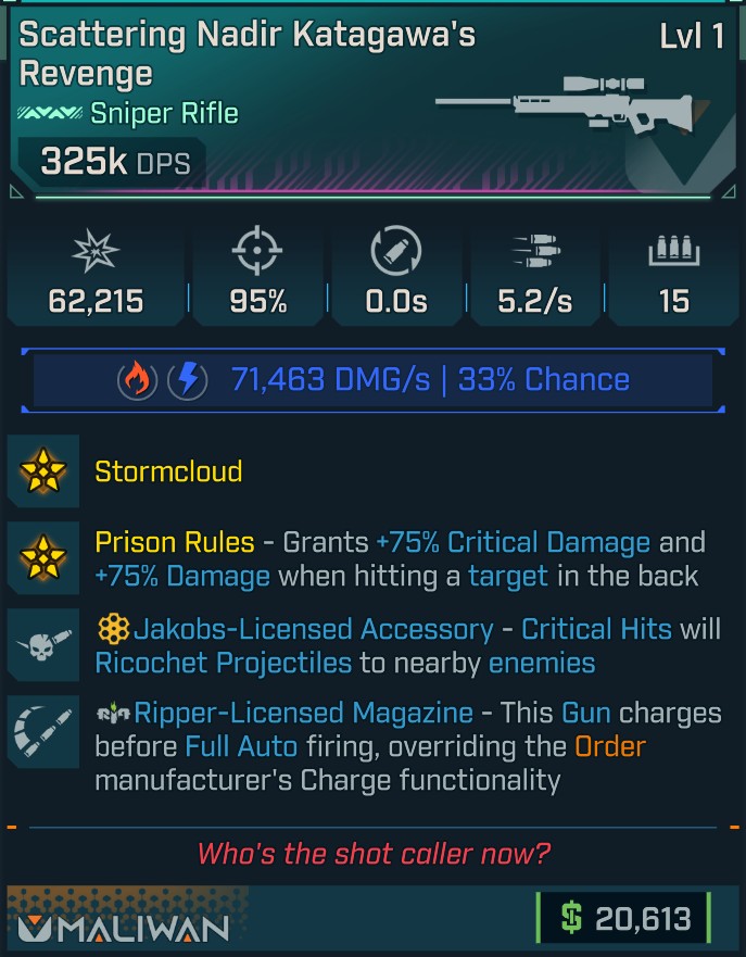 ⭐[PEARLESCENT] L1 KATAGAWA'S REVENGE - 325K DPS (+71k SHOCK/37k FIRE DMG/s) - 5.2/s F.R - NO RELOAD⭐